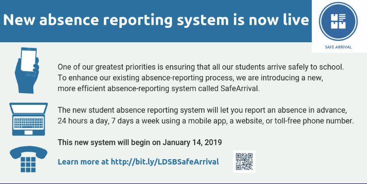 Please note if using the telephone option, we have a new number as of Monday, January 14, 2019.  Please call the new automated system at 1-855-257-9349 toll-free to report a student absent. This number replaces the school attendance line (613-544-9051).  Please use only the new 855 number. In addition, we strongly suggest parents add a PIN code to the system.